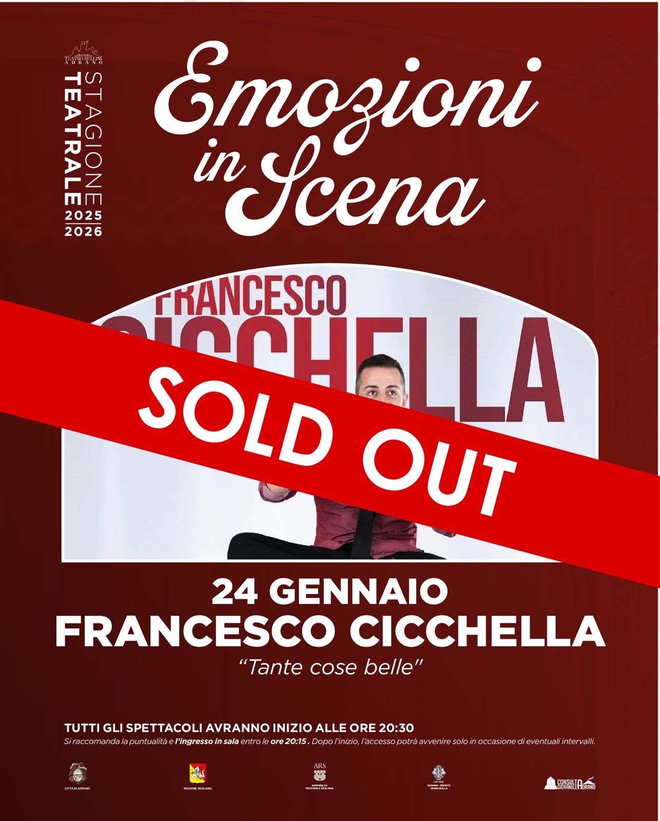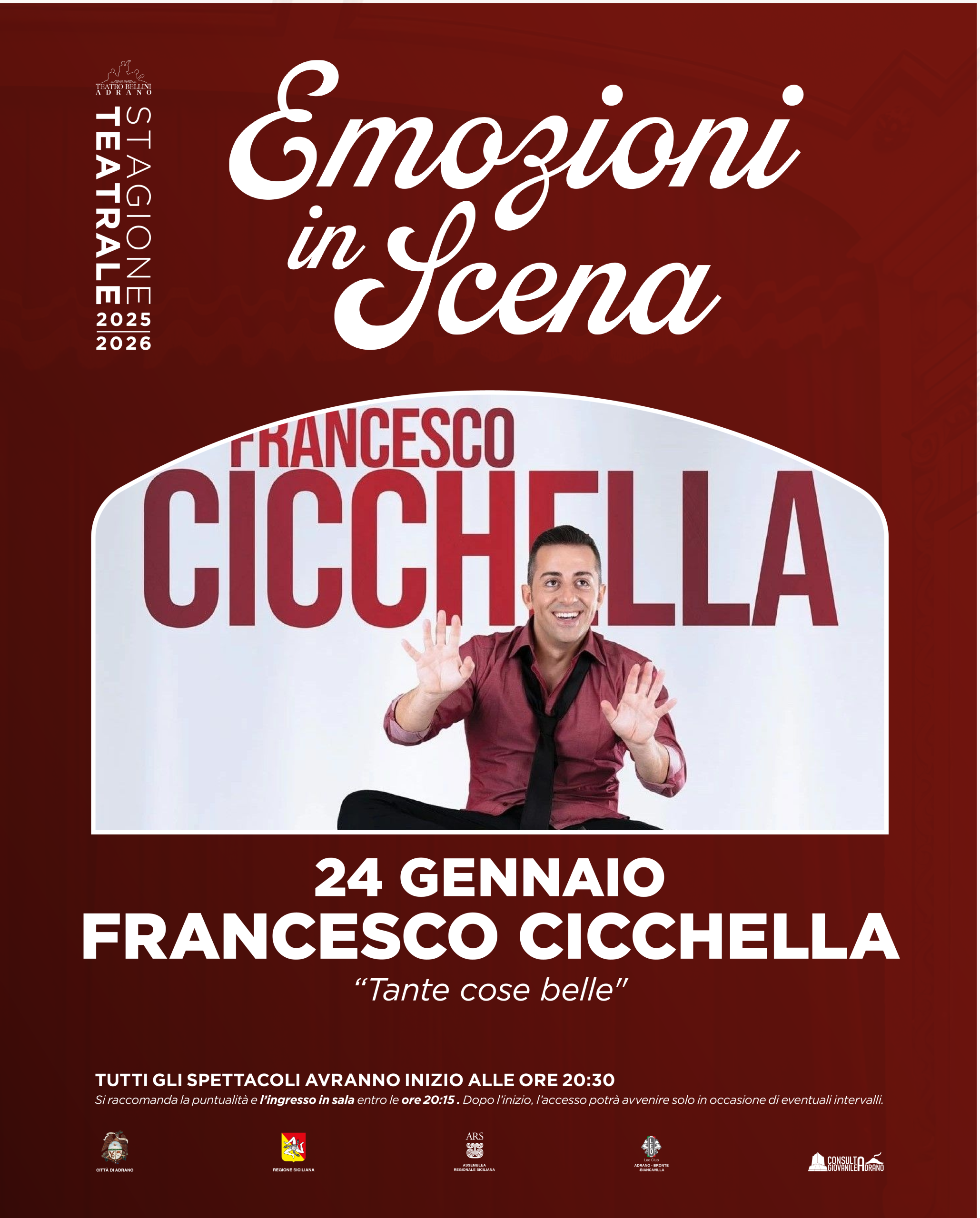 Il Teatro Vincenzo Bellini di Adrano accoglie Francesco Cicchella con “Tante cose belle”, uno spettacolo brillante e coinvolgente che unisce comicità, musica e imitazioni in un ritmo serrato e irresistibile.