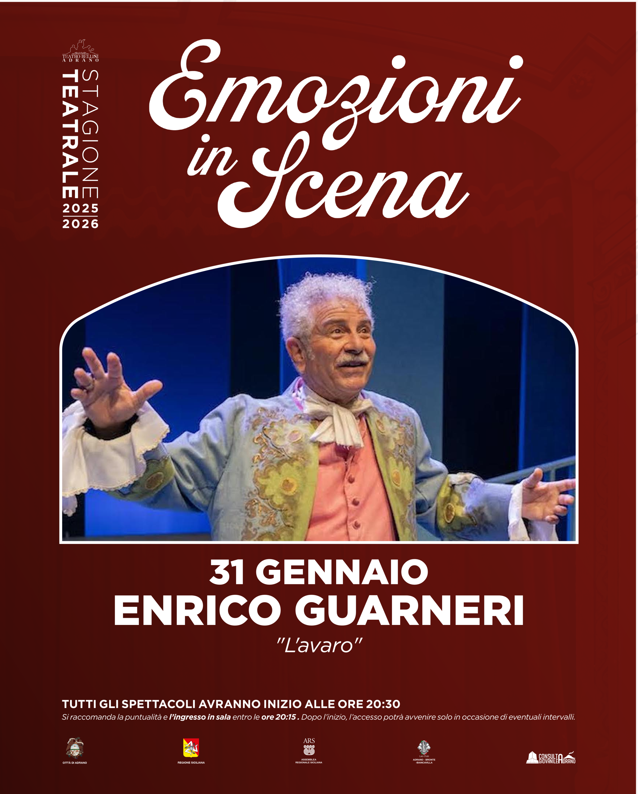Un grande classico della commedia prende vita sul palco del Teatro Vincenzo Bellini di Adrano con uno dei suoi interpreti più amati: Enrico Guarneri, protagonista de “L’avaro”. Ispirata alla tradizione teatrale più autentica, questa messa in scena racconta con ironia e intelligenza i vizi, le manie e le debolezze dell’animo umano, attraverso un personaggio iconico che continua a far ridere e riflettere, ieri come oggi.