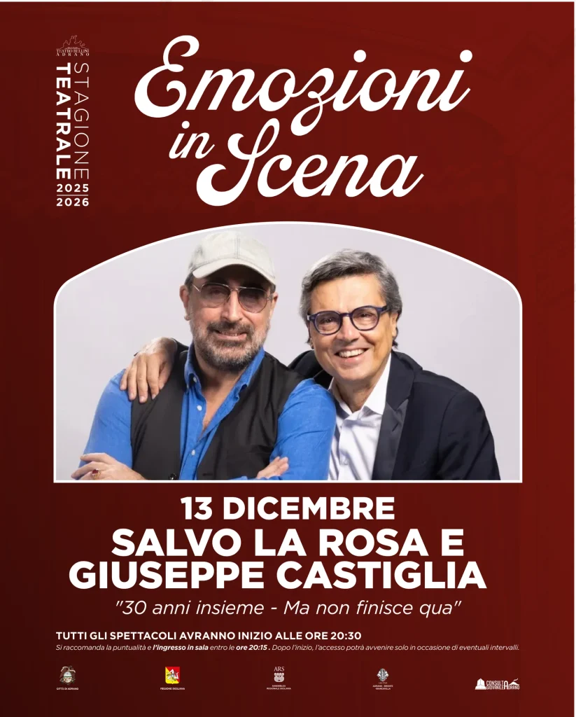 Un’amicizia lunga trent’anni, una carriera fatta di spettacoli, televisione e complicità autentica. Salvo La Rosa e Giuseppe Castiglia tornano insieme sul palco del Teatro Vincenzo Bellini di Adrano con “30 anni insieme – Ma non finisce qua”, uno show che è al tempo stesso celebrazione, memoria e divertimento puro.